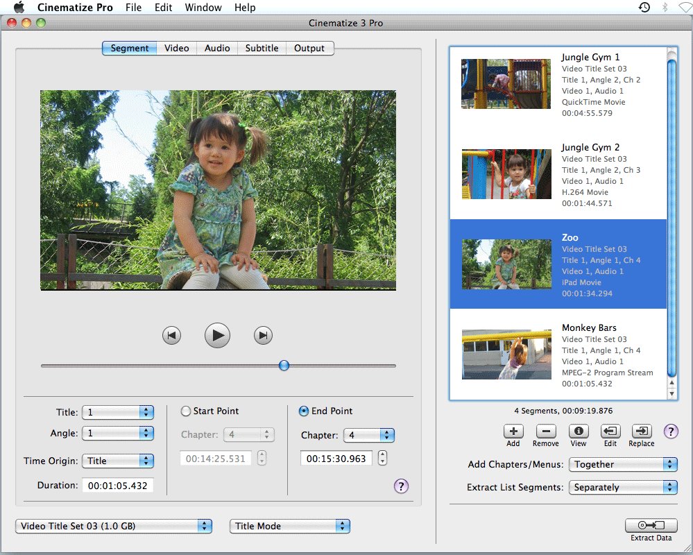 With Cinematize 3, DVD clip extraction is a piece of cake. Select clip using the new improved preview and decide options for video, audio, subtitle, and output. Then add as many clips as you like to the newly enhanced Extraction List. Review the list and hit the Extract button. Now sit back and relax. Let Cinematize 3 Pro do the work for you while you take it easy! Cinematize is no longer being sold. Only demo versions are available.